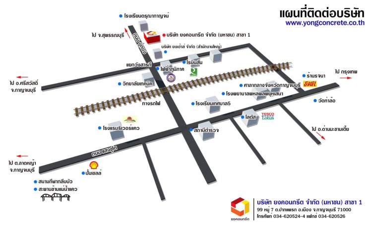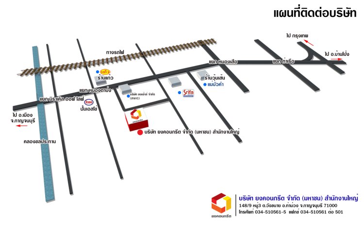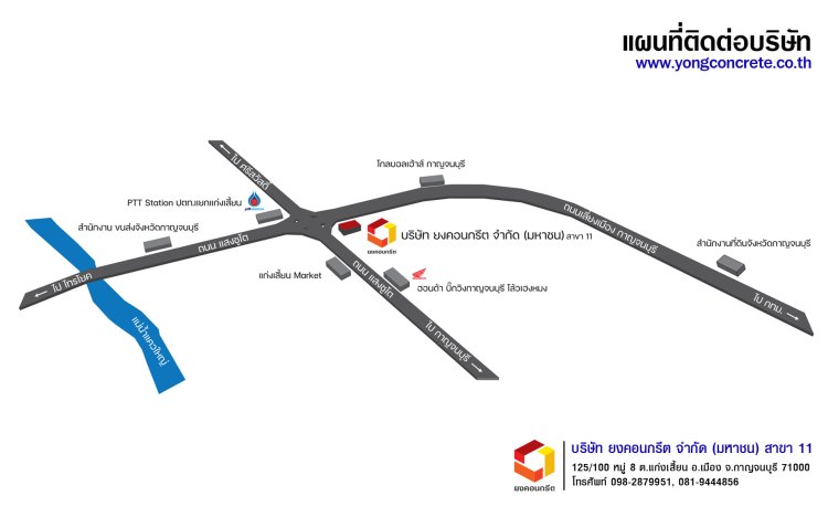 บริษัท ยงคอนกรีต จำกัด (มหาชน) สาขาแก่งเสี้ยนที่อยู่ : 125/100 หมู่ 8 ตำบลแก่งเสี้ยน อำเภอเมืองกาญจนบุรีจังหวัดกาญจนบุรี 71000โทร : 098-2879951, 081-9444856